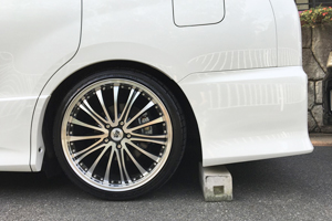 日常生活に支障の無いように、車止めブロックを前後に置いてギリギリの高さを調整。(ブロックは概ね10?12cmが多い)